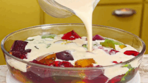 - Em uma travessa, de preferência de vidro, faça uma camada com fatias finas do bolo (não precisa untar a travessa e nem molhar o bolo).