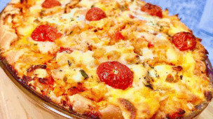 - Deixe amornar, desenforme e sirva a torta salgada aberta.