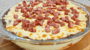 Leve para assar em forno pré-aquecido a 180 °C, por, aproximadamente, 50 minutos a 1 hora, mas faltando 10 minutos para acabar esse tempo, coloque fatias de muçarela sobre o rocambole, voltando ao forno para gratinar.